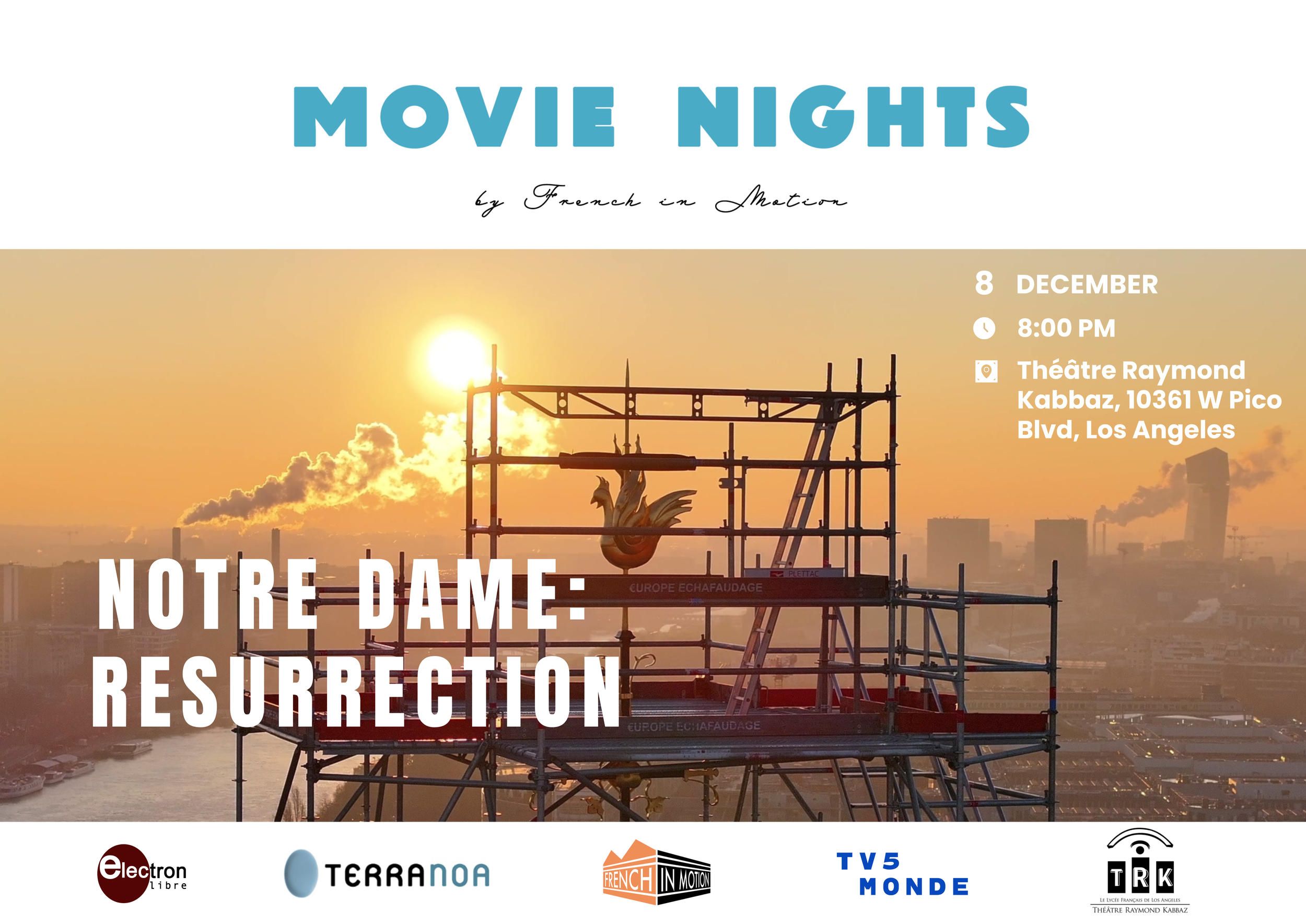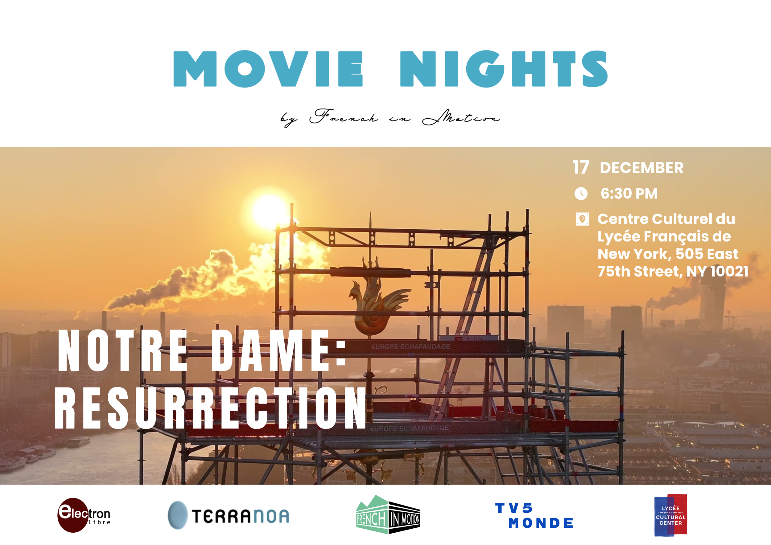 7:30 PM: Premiere screening of "Notre Dame Résurrection": 5 years at the heart of the largest restoration project, inside and outside Notre-Dame de Paris.